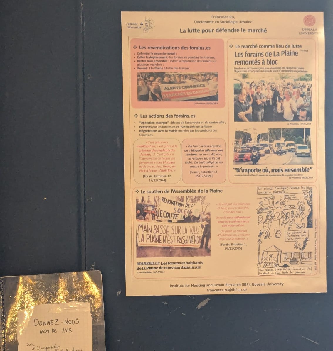 Francesca Ru, doctorante en sociologie à l’Université d’Uppsala (Suède), présente les résultats d’une recherche exploratoire sur les effets de la rénovation de la Place Jean Jaurès, sur l’activité foraine du marché de la Plaine. Ses travaux sont exposés du 14 septembre 2025 au19 octobre au Bar de la Plaine, 57 Place Jean Jaurès.