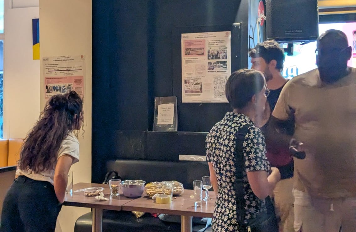 Autour de quelques verres de pastis et de chips, habitants.es, militants.es de l’Assemblée de la Plaine et même un forain – venu spécialement malgré le dimanche où il ne travaillait pas – échangeaient sur les transformations du quartier et sur l’impact de la rénovation de la place Jean-Jaurès sur le marché de la Plaine.